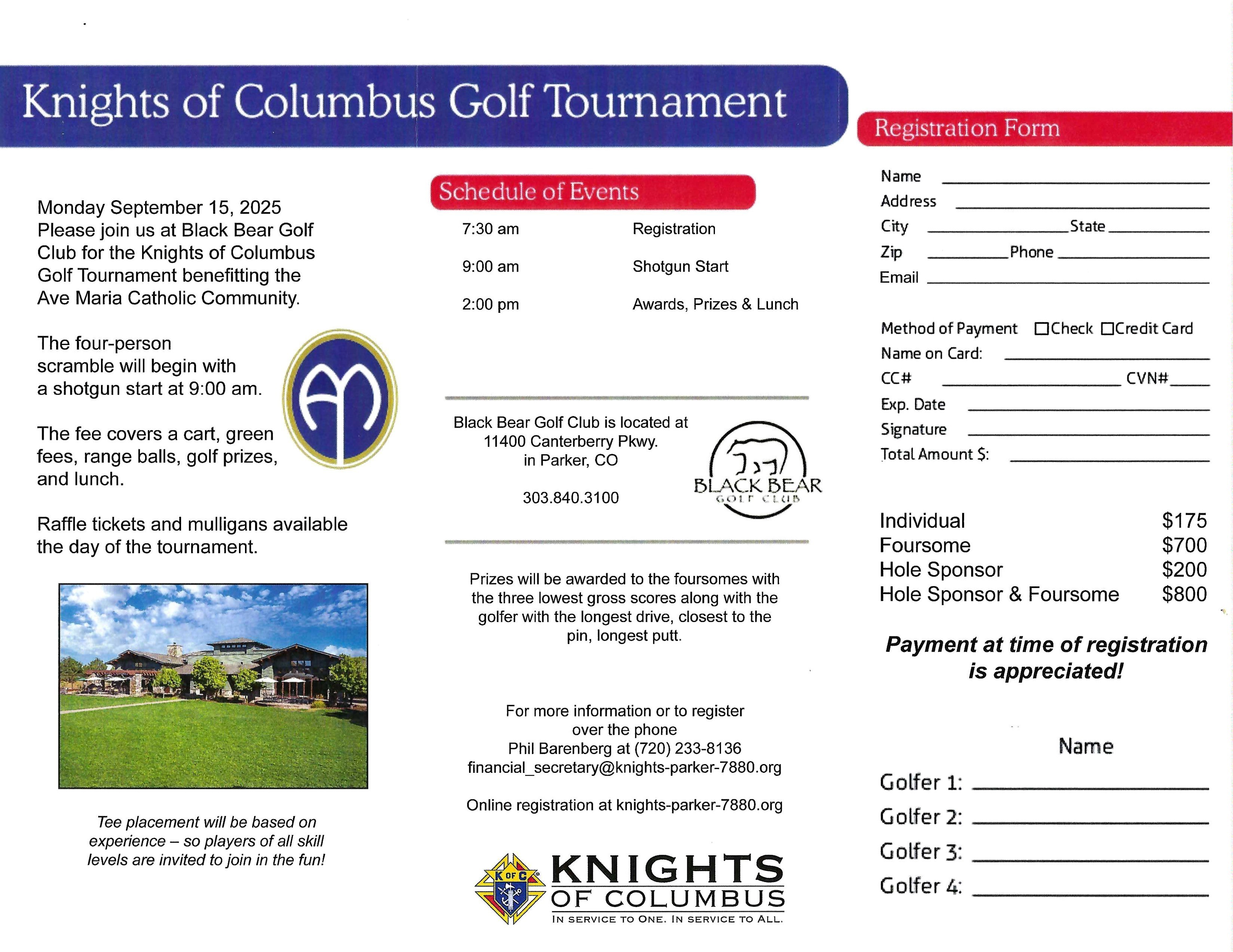 Welcome and thank you for registering with the Knights of Columbus 7880 Annual Golfing Event.